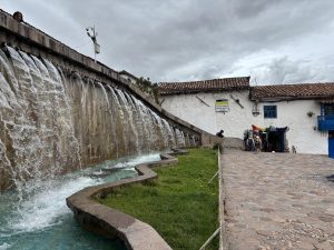 Then we took a circumbendibus route past a Plaza with a market and some sort of municipal event in preparation. We stopped for coffee and a humungous fresh pineapple juice, before making our way to San Blas, a lovely square with an impressive fountain and backpacker shops.