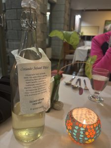 The food was great. We were given Coriander-infused water; Peter had a glass of suspect red wine. There was only one other couple staying at the hotel, from Shrewsbury and we shared in her surprise birthday cake!