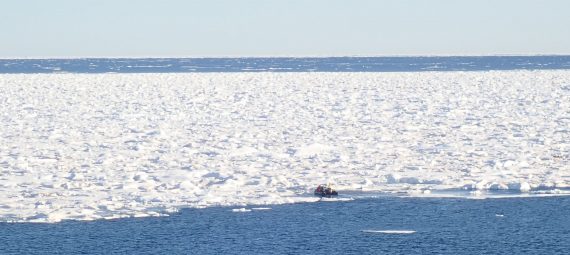 We awoke to find the ship sailing, apparently without any sea ice, but then it slowed until it came to an almost complete stop to pick a route through the sea ice. The ice pilot had determined at 10.30 the night before, that the ship could navigate the sea ice as the big sheets of ice had moved westward, allowing us passage. It was slow going through the ice which sometimes looked almost impenetrable and other times the sea looked clear. Progress was slow through the James Ross strait as the water was relatively shallow for a ship of our size.
