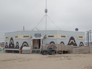 We stopped off at a Heritage Centre, where we all struggled to remove our boots in a cramped vestibule. We spent an enjoyable 3/4 hour shuffling through the very nice exhibition of Inuit life, which includes the Ship’s Bell of HMS Erebus.