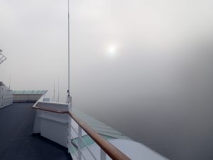We awoke to fog. Whilst we thought the ship was anchored in Cambridge Bay, we couldn’t see land at all.