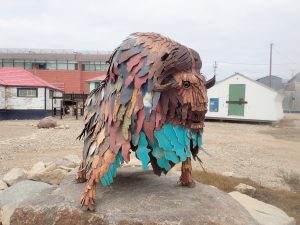 Then finally we took one of the last Zodiacs to Cambridge Bay, a conurbation of less than 1800 people. However it sounded like our plane was still boarding 40 minutes prior and thus we were not expected to take the bus to the airport until 16.00. It was 14.30. Peter and I declined the guided tour of the town, which in our experience doesn’t incorporate the transfer of much knowledge and adopts the speed of the slowest person. We set off to look at a heritage installation, made of recovered and heritage items by the Red Fish Arts Gallery, which was very good.