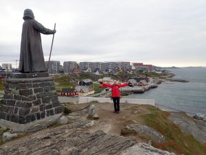 Learning about the Dorset tribes, the Norsemen and the Inuit, interesting as it was, exhausted us, and we needed to pay attention to stretching our legs! Near the museum we clambered up a rocky hill to pay regards to Hans Egedes, the ‘founding father’ of Nuuk.