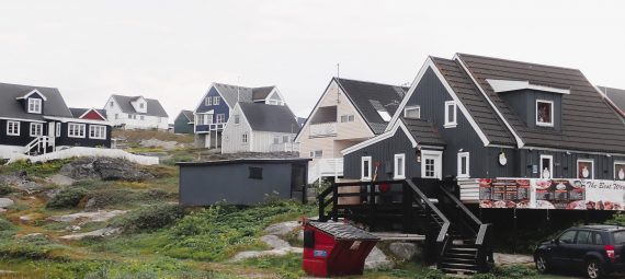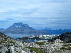 Searching for the ‘First House’ took us to the Northernmost edge of Nuuk, where we exchanged pleasantries with a Nuuk inhabitant who was complementary about the English sense of humour… We turned back after having scaled a rocky hill giving us an impressive view over the imposing shape of the Sermitsiaq mountain, to the North. We also managed to get slightly entangled in wooden pathways and staircases, leading us to the base of a giant telecommunications satellite dish. We are sure we really should not have been there!