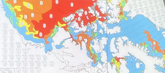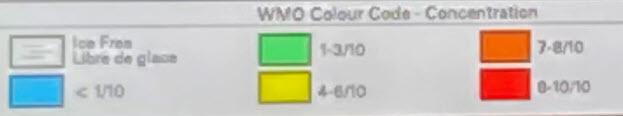 Our expedition briefing showed us the most recent ice charts of the Northwest Passage, as we plot the way through. We will not be able to pass through any ice concentration colour coded above yellow.,