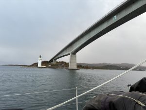 It was not for another twenty one hours and another night aboard ship that we finally reached Skye, passing under the bridge by the Kyle of Lochalsh with just 5 meters height to spare. Timing was crucial to navigate the narrow Sound of Sleat after the bridge when the tide would only make that possible between 8-12 in the morning.