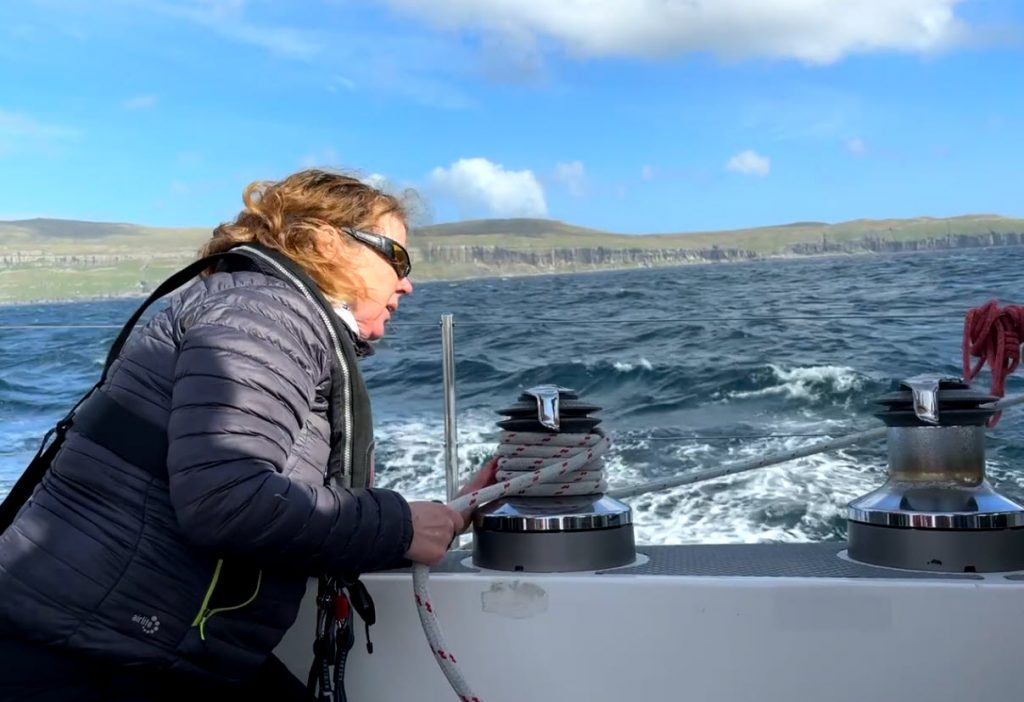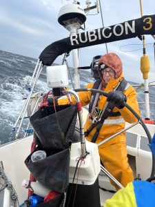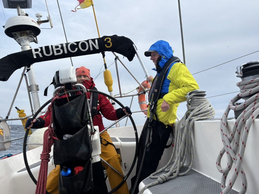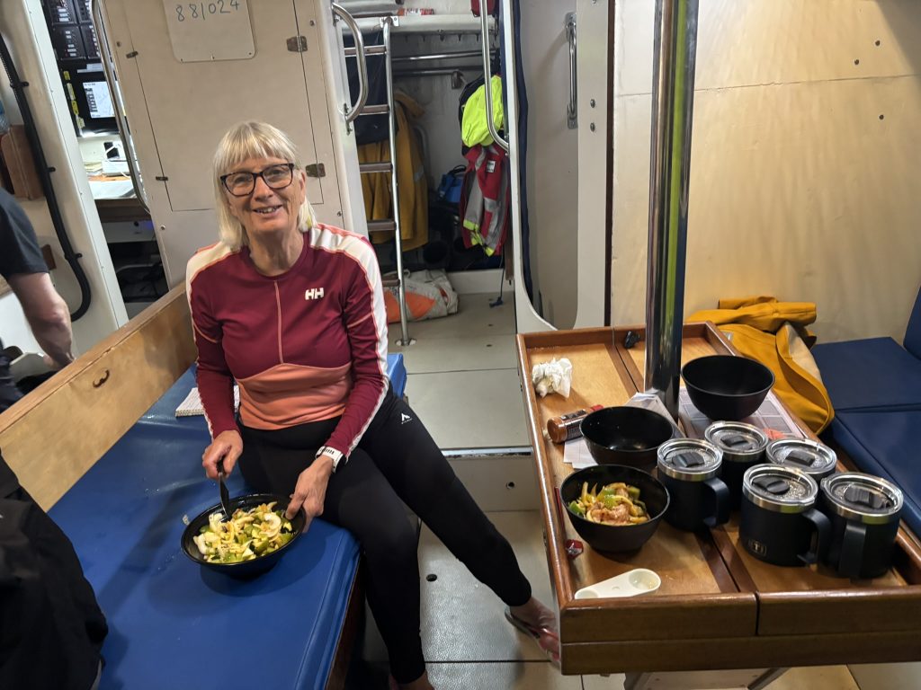 Lynne would get up out of her bunk 50 minutes before her shifts, as she needed an unhurried opportunity to get on all her layers of gear, (including her thermals, fleeces, Fladen suit and foulies) as it was nigh impossible to stand. Also, she wanted to make a hot drink for the lads who were coming off their shift. And this included her 3am shift as she valued 5 minutes in the cockpit with Peter before he retired to his bunk. After all, we were supposed to be on holiday together!