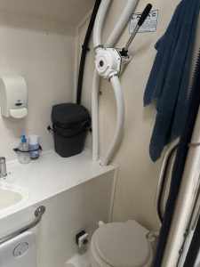 It is worth noting that the Head was manually operated! After finishing, the seat and lid had to be closed, making sure rubber strips created a vacuum tight seal. Then the handle needed to be pulled about 15 times, then, after a short wait, another 5-10 times. The flushing of the toilet, plus the pumps for the water and drains all made quite a racket.