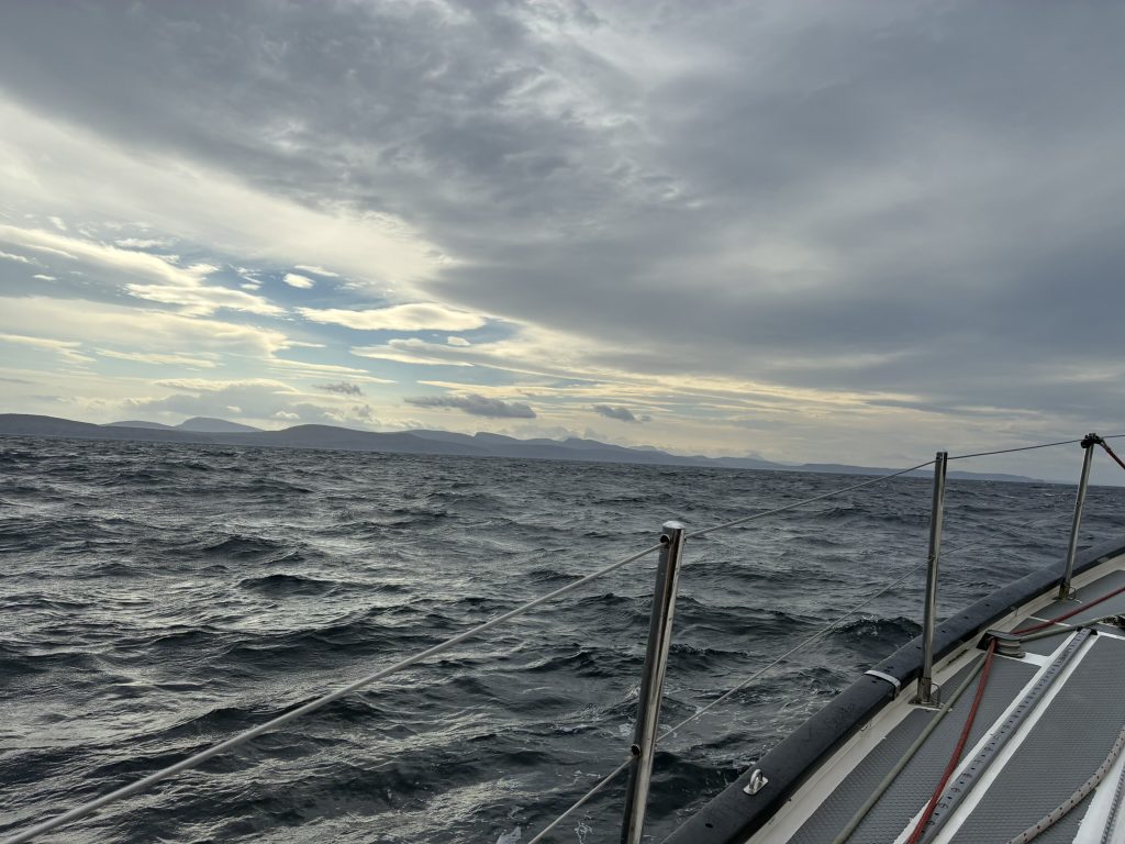 We finally spied the coast of Scotland on the morning of the third day, but with bad weather forecast our skipper determined to keep going with shelter from the strong winds provided by land on both sides of the Minches, the strait between the mainland and the Outer Hebrides.