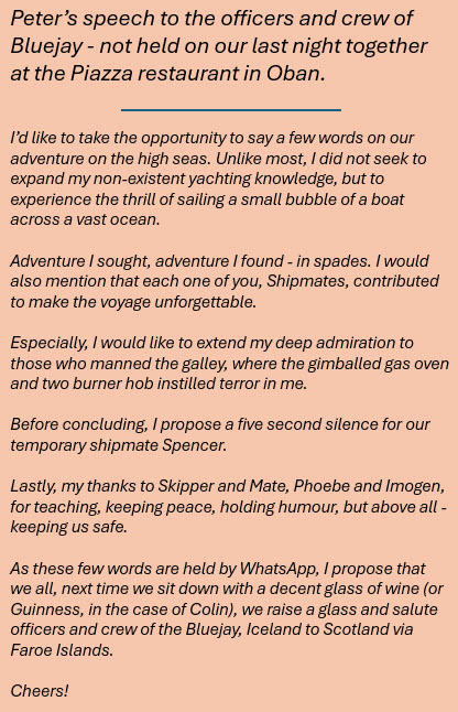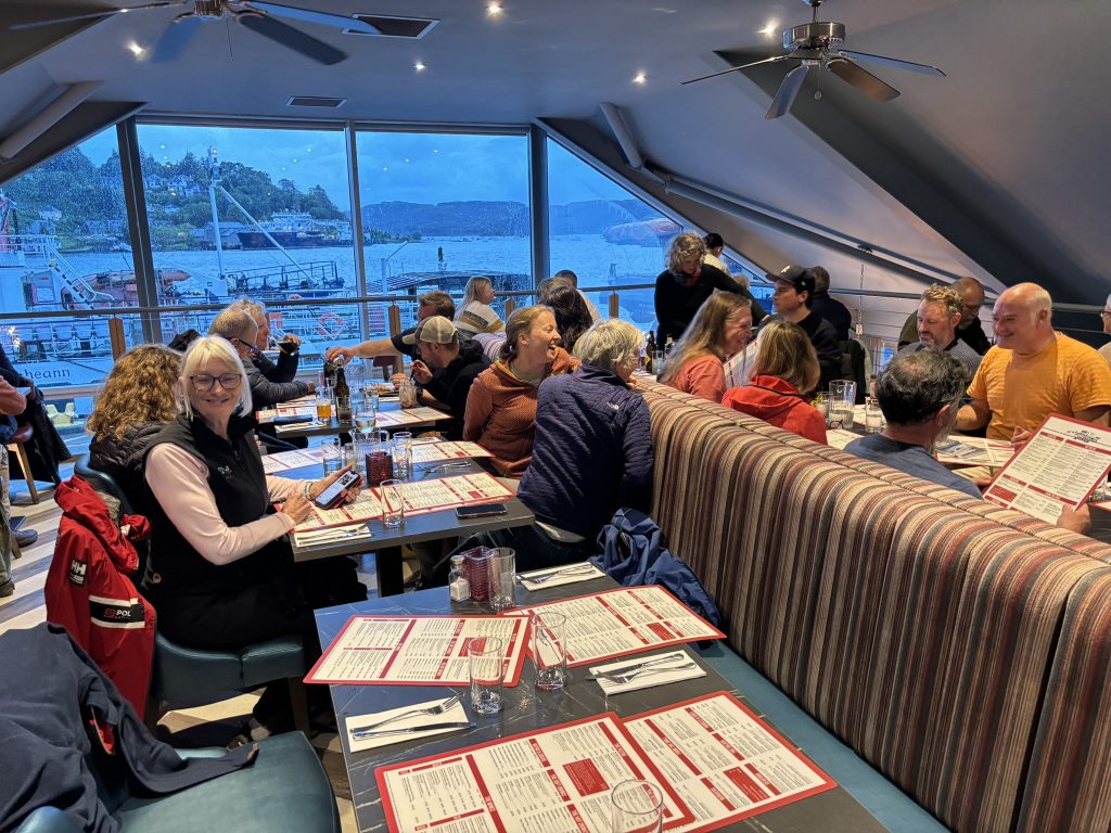 Dinner was pleasant enough, although Lynne’s garlic allergy precluded her from enjoying a pizza; it was also too raucous for Peter to deliver the few words he’d assembled to express his gratitude to our skipper and mate, together with his admiration for the crew.