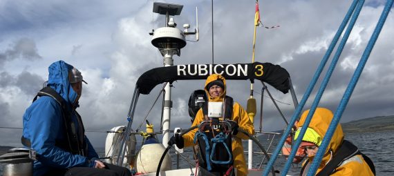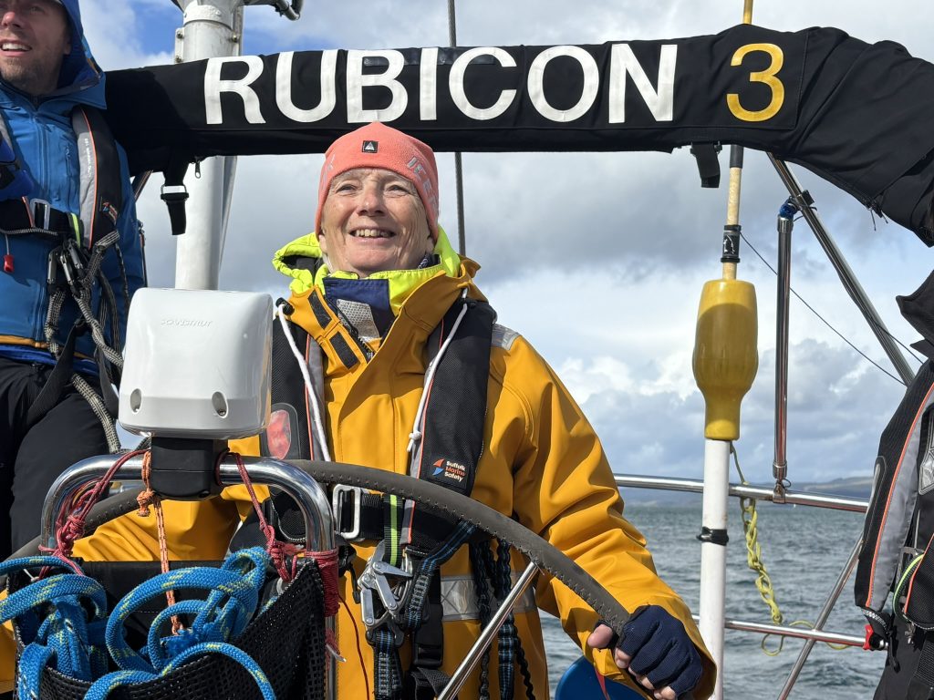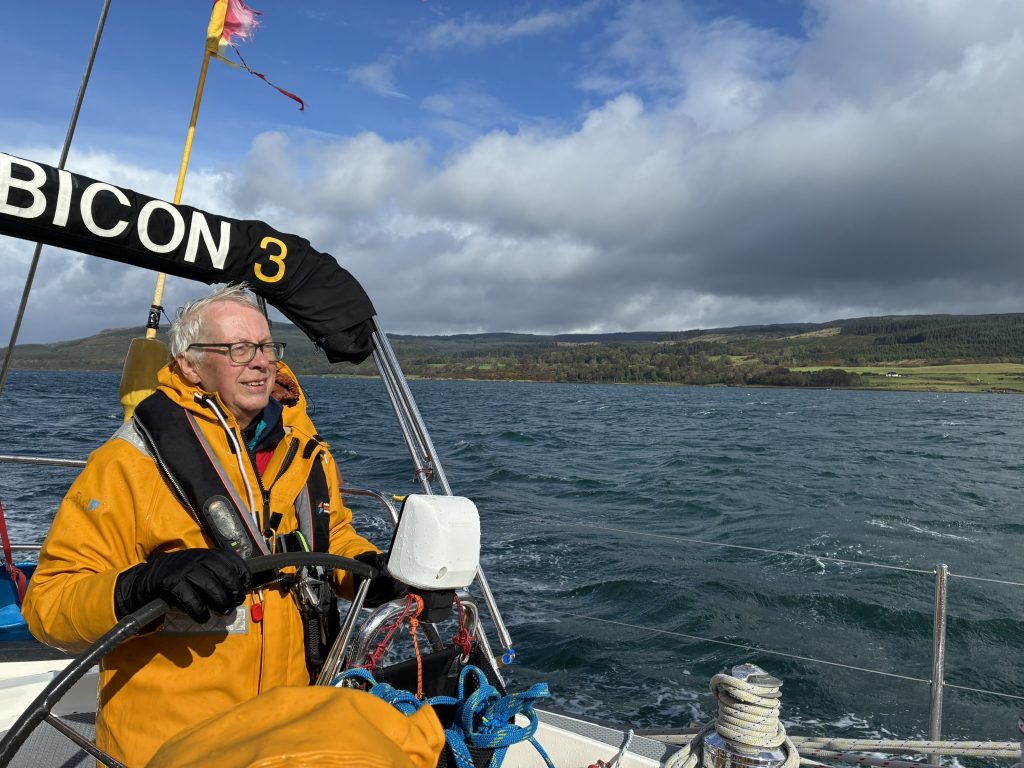 The wind was behind us, and we made speedy progress down the Sound of Mull. Lynne was delighted to clock a speed of 9.9 knots, as she turned to catch the wind, much more confident at the helm than her first attempts.
