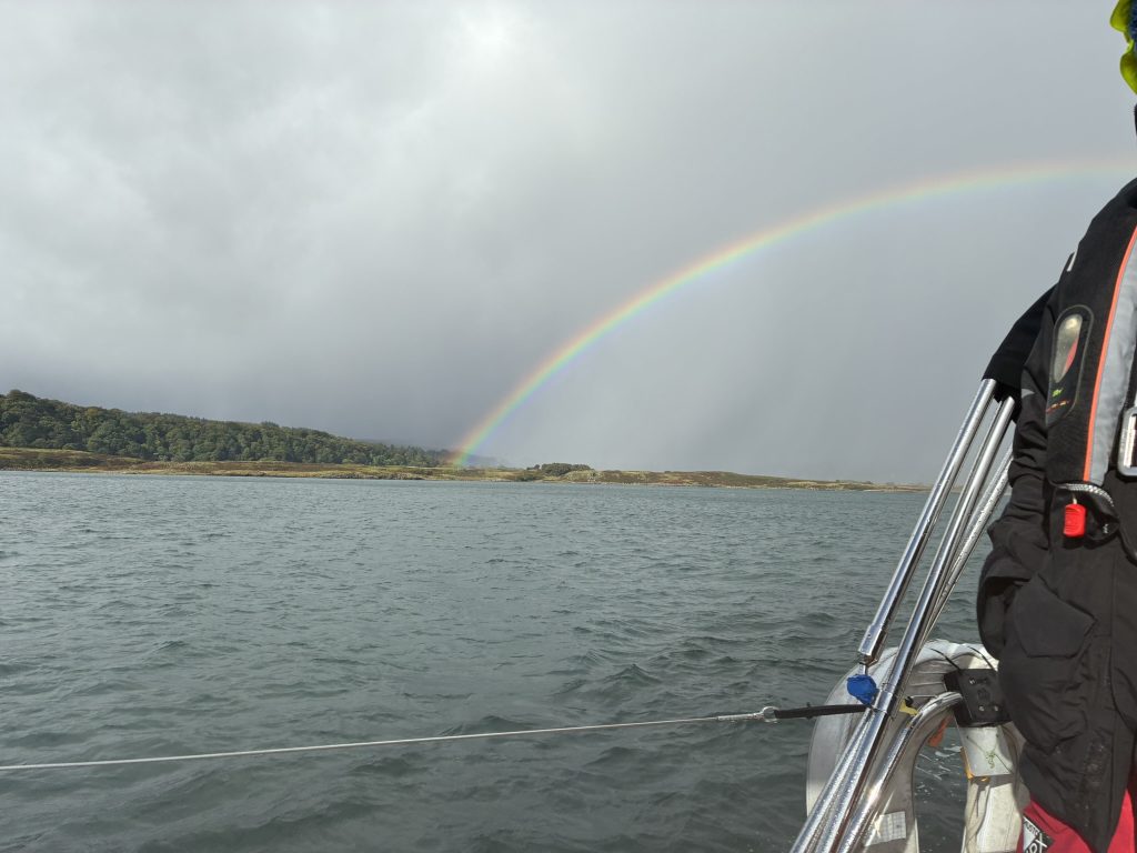 Today was to be our last great sailing day. Peter eased himself down into the rope locker for the first time to stow the mooring lines and fenders and lost his beanie in the process. We needed a spring line to pivot out of our mooring. We set off having to avoid all the little motor boats coming into the Tobermory harbour. The weather was changeable, intermittent sun, rain showers and rainbows and cloudy skies.