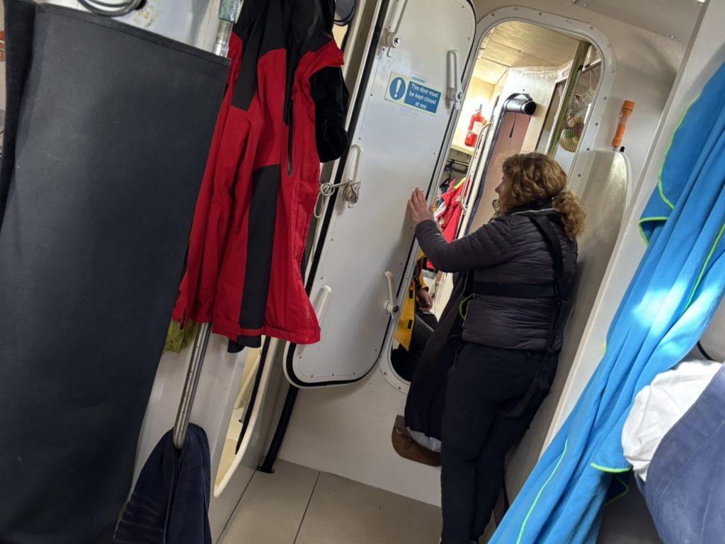 Lynne hadn’t expected that the only warm place on board was inside her sleeping bag; nor that she would be putting on wet socks and shoes in the morning. It took us a long time to acclimatise to the weather up north, probably due to our experiencing a very hot summer in France with the temperatures hovering around 40C. We certainly didn’t need to take our shorts or swimming togs. Thank goodness for the down Fladen suits provided to us, although wearing them together with the foulies, inhibited mobility.