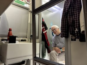 You might be forgiven for expecting that we’d be used to sleeping in a moving bunk, but Lynne didn’t sleep at all well, feeling the motion was at odds with the direction of travel! This might have been exacerbated by polishing off the hip flask of Armagnac we had brought with us, for medicinal purposes only, and hadn’t needed on the trip!