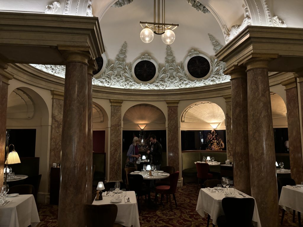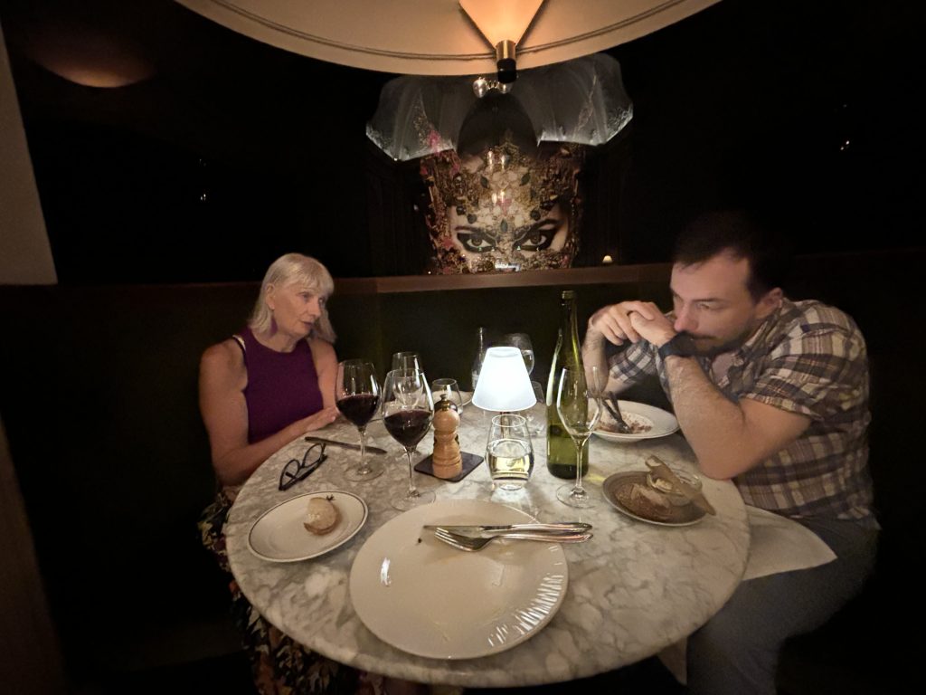 The food was excellent, the crémant and Pinot noir delicious. We were regaled with stories of escapades in London by our rather imposing but friendly sommelier. An early night followed as Chris had to arise before dawn for his earlier flight home.