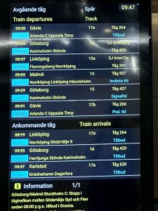 Trains had updated departure times but still in the past. In the confusion, we boarded the train to Göteborg as advised by the platform indicator, only for all Gothenburg passengers, including us, urgently ordered OFF by the train manager as the train was going to Linköping instead…
