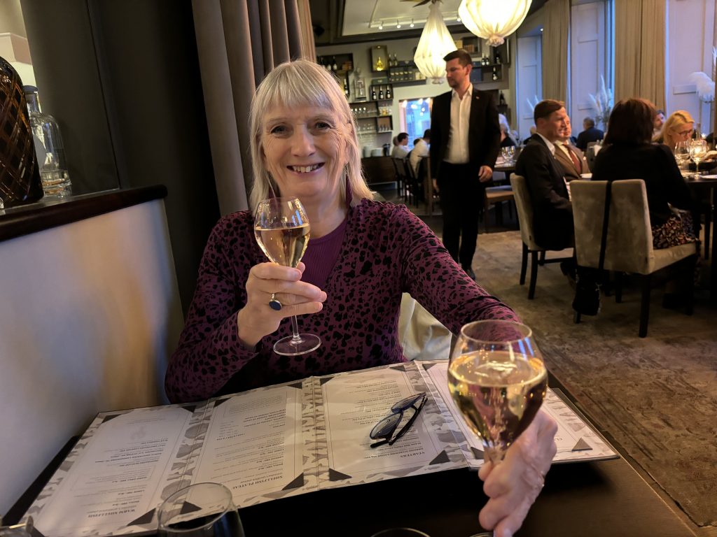 Dinner was at the elegant Fiskekrogen restaurant, where we discovered that our server had also run the Stockholm half-marathon on Saturday. We rose a glass for Kirsten’s birthday. Allergy tables were reversed, as Lynne enjoyed lobster, to which Peter is allergic.