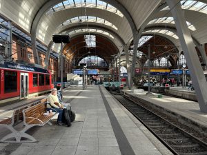 We had received clear instructions that we head left out of the quay but did a double-take when the signage directed us right! A 20 minute walk to Kiel Haubtbahnhof found us early enough to consider taking an earlier train – judicious, after our earlier experiences with delayed trains. This turned out not to be possible, so we settled down for a second breakfast at the Crobag, involving croissants, on a platform bench. The station was elegant, small, tidy and peaceful in comparison to any other city station. Our train arrived at the right platform, and, to our relief, departed only one minute late.
