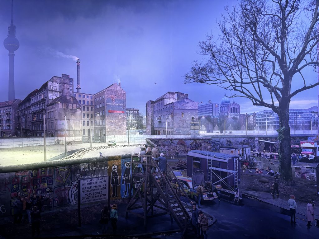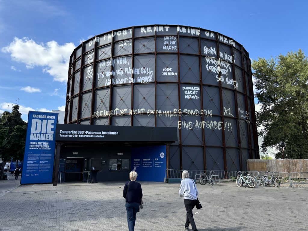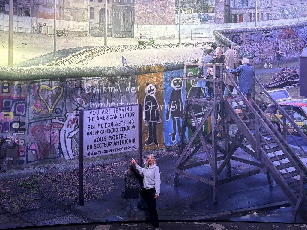 Not far away, we immersed ourselves in the chilling feeling of being at the Berlin wall. We experienced an enormous surround screen, created by artist Asisi, inside a large cylindrical building. With eerie lighting and sharp, edgy audio of GDR propaganda speeches and radio from the time, you could easily feel that you were THERE. A superb and very emotional experience.