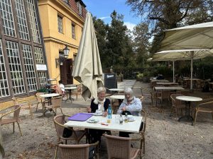 A short, unmissable stop at the Brandenburg Gate, where Peter had entered into East Berlin with Katharina and her sister Regina before the Wall was demolished. We avoided the long queues to enter into the Reichstag building, with its elegant glass cupola. Katharina had further sightseeing planned but first a stop by the delightful ‘Kleine Orangerie’, at Schloss Charlottenburg where we had a light lunch in the sun, consisting of potato soup, or potato salad with or without frankfurters – ‘with’, for Peter!.