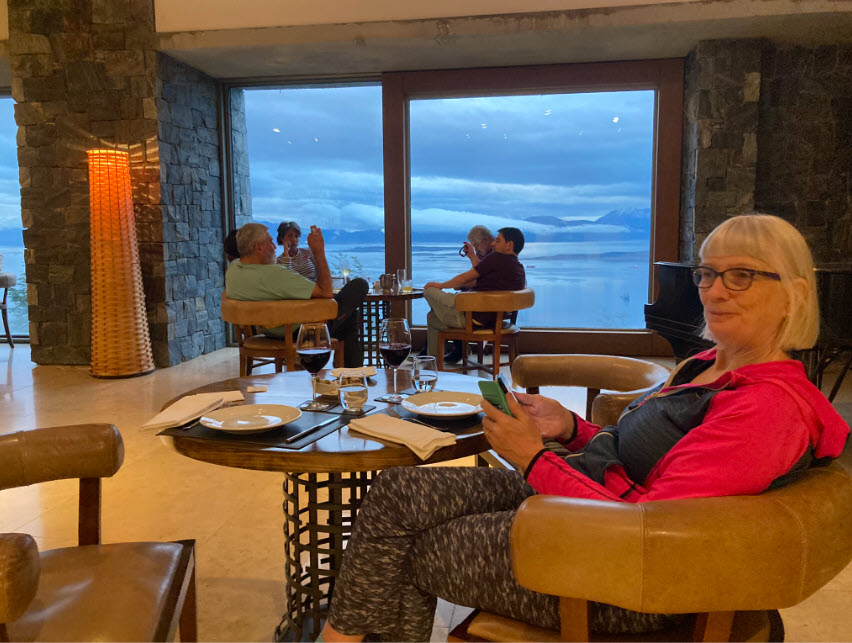 Three and a half hours and one small cereal bar later, we touched down in a darkening Ushuaia. Exhausted, we were bussed to the fabulous Arakur hotel, where, gratefully, we shared a club sandwich and each enjoyed a glass of delicious Argentinian Malbec from the Zuccardo Mendoza vineyard.