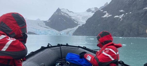 We had some passengers that were keenly feeling the cold, in the increasingly strident rain. We performed a zodiac-to-zodiac transfer, where they could be transported back to the ship in another zodiac. The rest of us headed inwards of the bay, surrounded by glaciers.