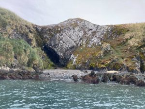 But the cave opening looked forbidding, and the rocky shoreside looked dangerous. Though among this, we saw resting and playing elephant and fur seals, stretching out luxuriously, obviously feeling quite at home.