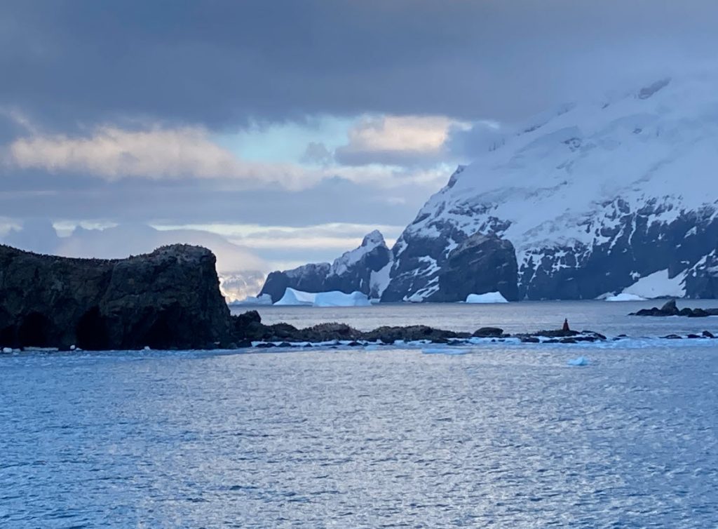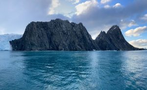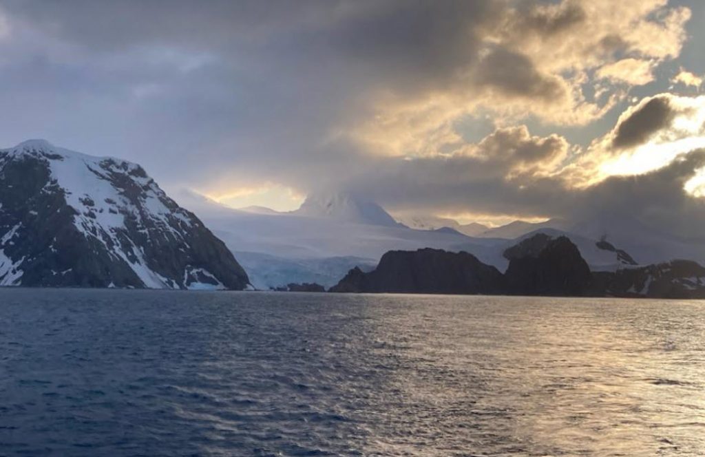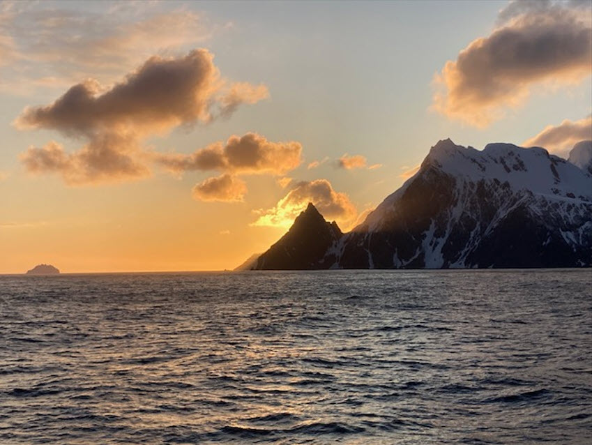 We were treated to some calving on the glacier beside it and beautiful sunlight on the snow and icebergs. We then sailed eastwards to Cape Valentine where the men had originally landed on Elephant Island, where the beach was unsuitable for staying. The views of the island were magnificent in the setting sun.