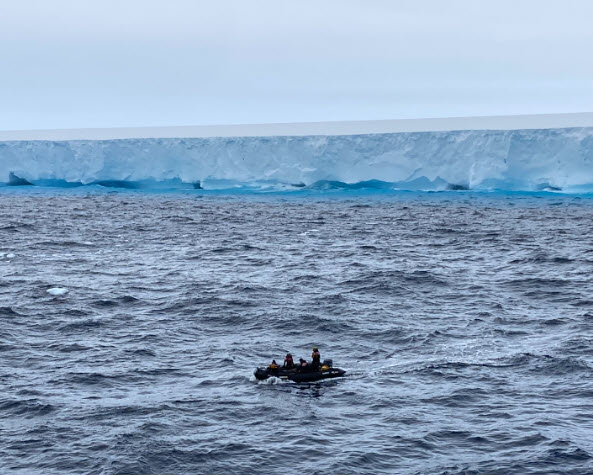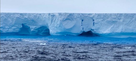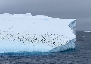 Thursday, we woke to the incredible sight of the world’s largest iceberg, A23a. It’s a tabular iceberg, two hundred and eighty metres high, showing twenty five metres above the water and about twice the size of Greater London or three times the size of New York City. When it calved in 1986 it was 5,883 square kilometres but got stuck in the Weddell Sea, making the news last year as it left the Weddell Sea being pushed towards the warmer waters off South Georgia. We sailed alongside it, enjoying the ice caves and blue colouring.