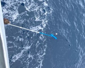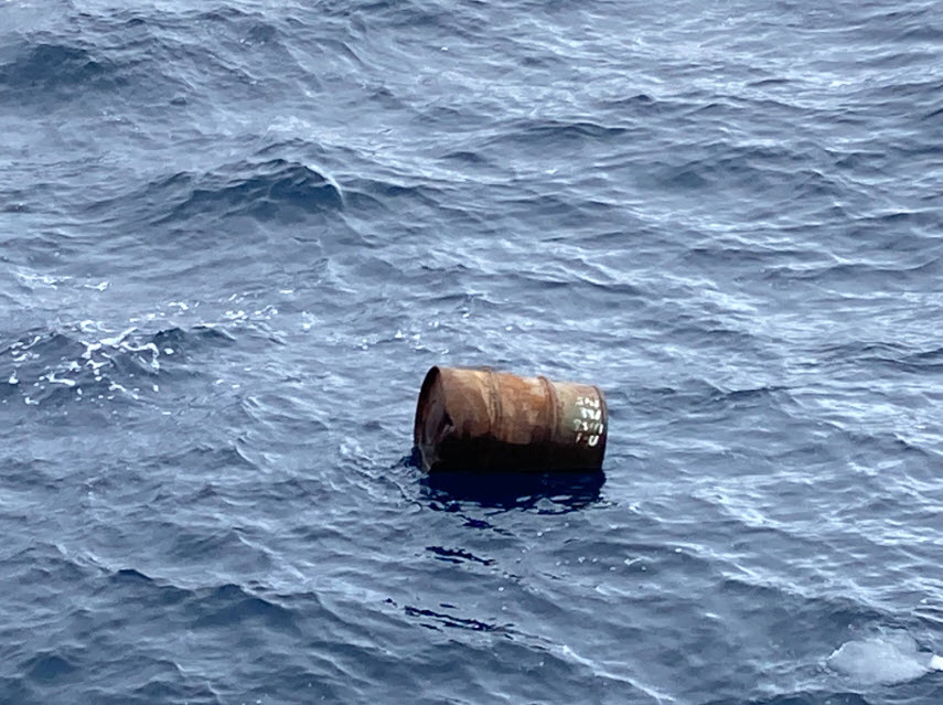 Then the ship turned again as a rusty barrel was spotted floating in the water. A Zodiac was lowered into the choppy seas, and despite the swell, some of the team managed to retrieve the empty barrel and prevent this larger piece of debris polluting the waters.
