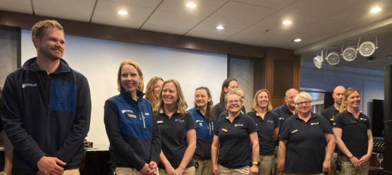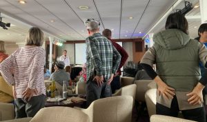 The most tense bidding was for a reusable coffee cup that a passenger accidentally dropped overboard, and was retrieved out of the icy water by a swimming pool net! The cup was claimed by the Captain as salvage, and was finally sold back to the original owner for $250. Jenn and Laura compered a hilarious, riotous session, eliciting top dollars for every item.