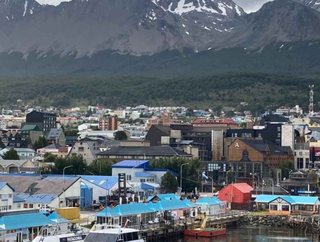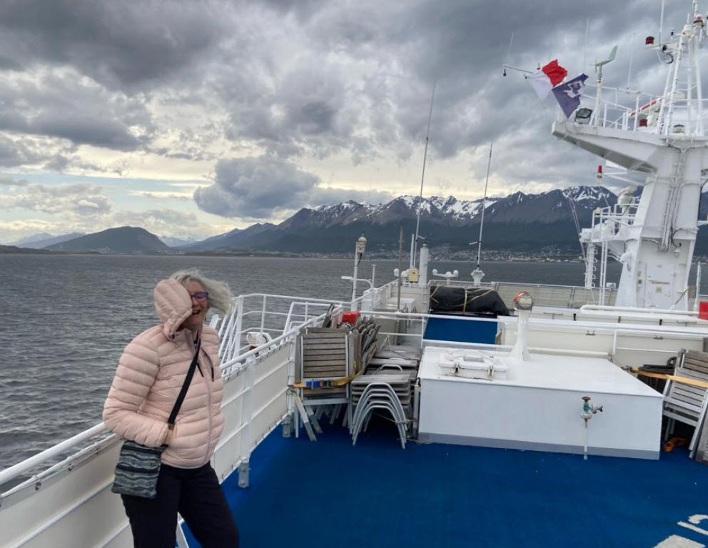 As dusk slowly set in, we both went up to the open Deck 8. The wind was rough, jackets, hair and ship flags flapping furiously. Ushuaia approaching with street lights and coloured festoons. Car headlights. Trees. Verdant. The Arakur hotel nesting, high up above the town.