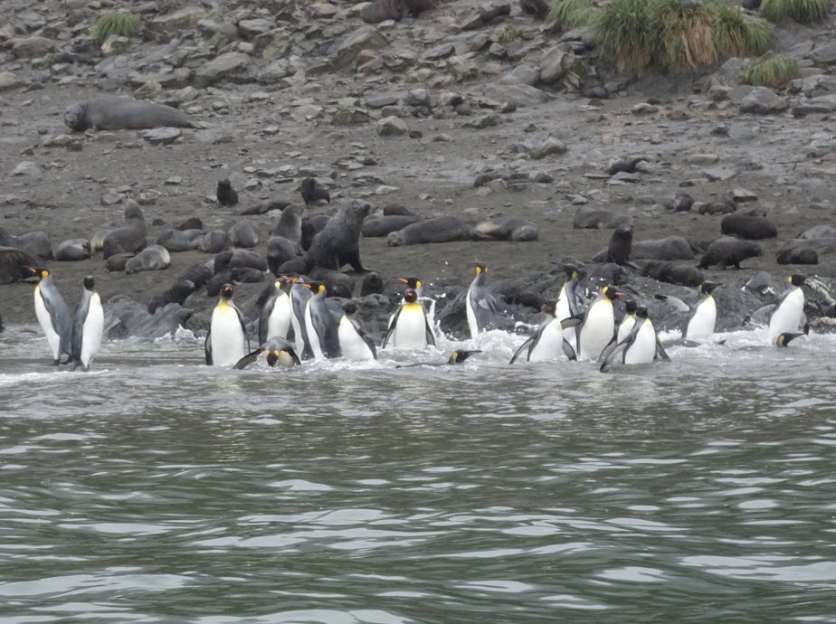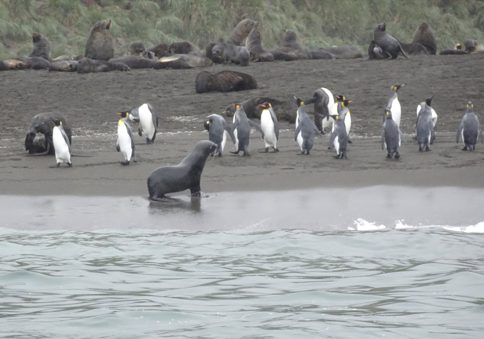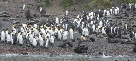 Forty-five minutes later, Lynne was beginning to wish she had done the same, as all the three pairs of gloves she was wearing, were wet through. When we rounded the rocks to an amazing sight of hundreds of tiny fur seal pups, including four cream-coloured ones and many king penguins, (but no Macaroni penguins), we felt it was well worth the endurance!