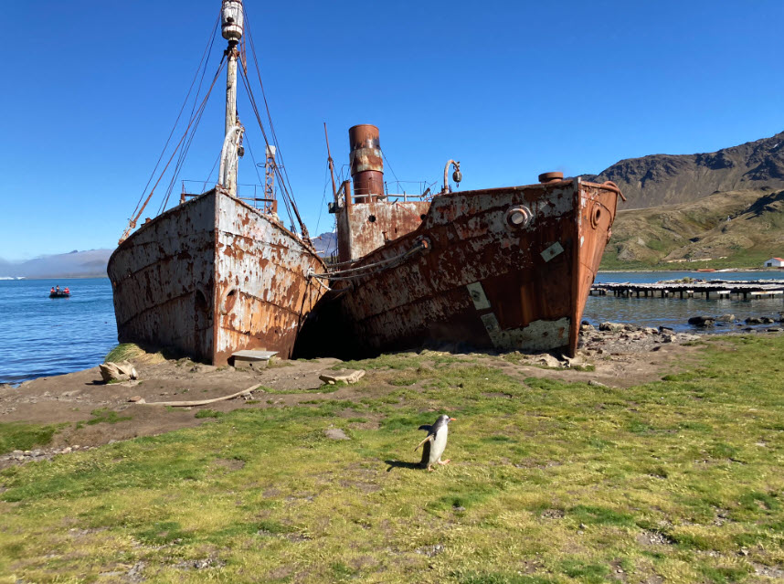 There is a museum, a church and a Post Office at Grytviken as well as many seals that have reclaimed the area. The museum exhibits some astonishing photos taken by Frank Hurley of the failed Imperial Trans-Antarctic Expedition 1914-1917 on the ship Endurance, and an interesting film about the sixty years of whaling at the station. The rusted machinery and tanks bear witness to the scale of the industry in its heyday, as do the rusting wrecks of the whale-hunting ships.