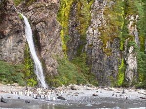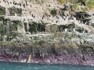 On leaving Stromness, the Seaventure doubled back to Hercules Bay, a tiny bay with the opportunity to see Macaroni penguins up close and perhaps a Light-mantled Albatross. A shore landing wasn’t permitted, but we were able to cruise around by the penguin colony and the small beach full of seals. Lynne left Peter aboard the ship, to catch up with our blog, and joined a Zodiac, where a number of the husbands had also decided to give the outing a miss.