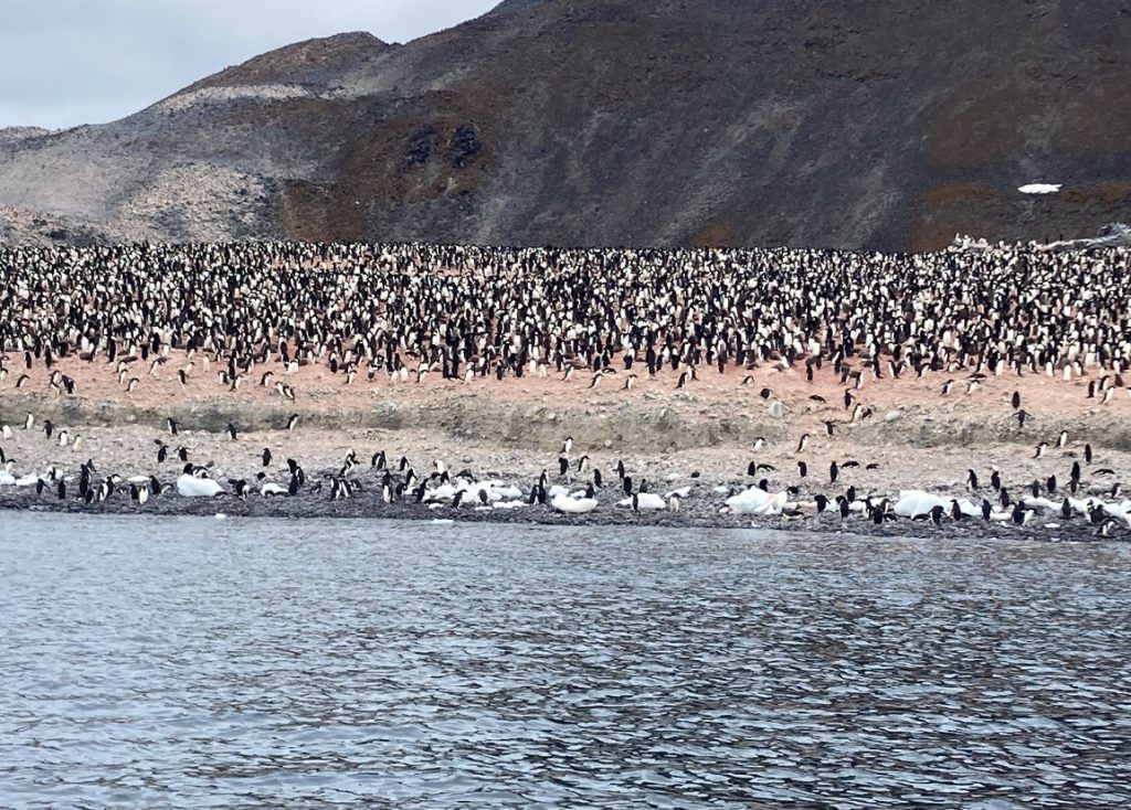 A landing was not permitted, as every accessible stretch of the shoreline is filled with penguins in vast colonies, with about 300,000 breeding pairs.