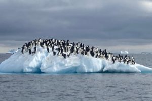 Our Zodiac gently approached a large, high iceberg, shaped like a steep, triangular sail. Hundreds of penguins populated the lower part of the iceberg, but many decided on ice-mountaineering, tackling sheer ice cliffs to reach the top of the berg.