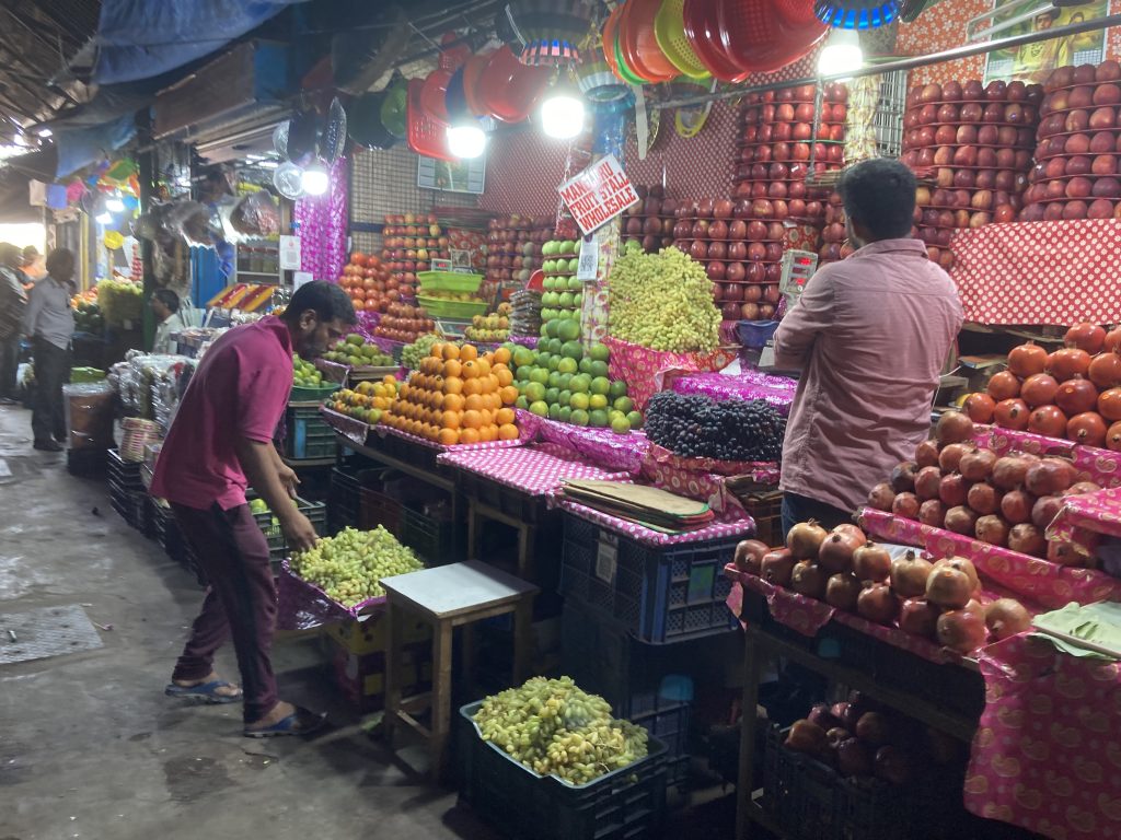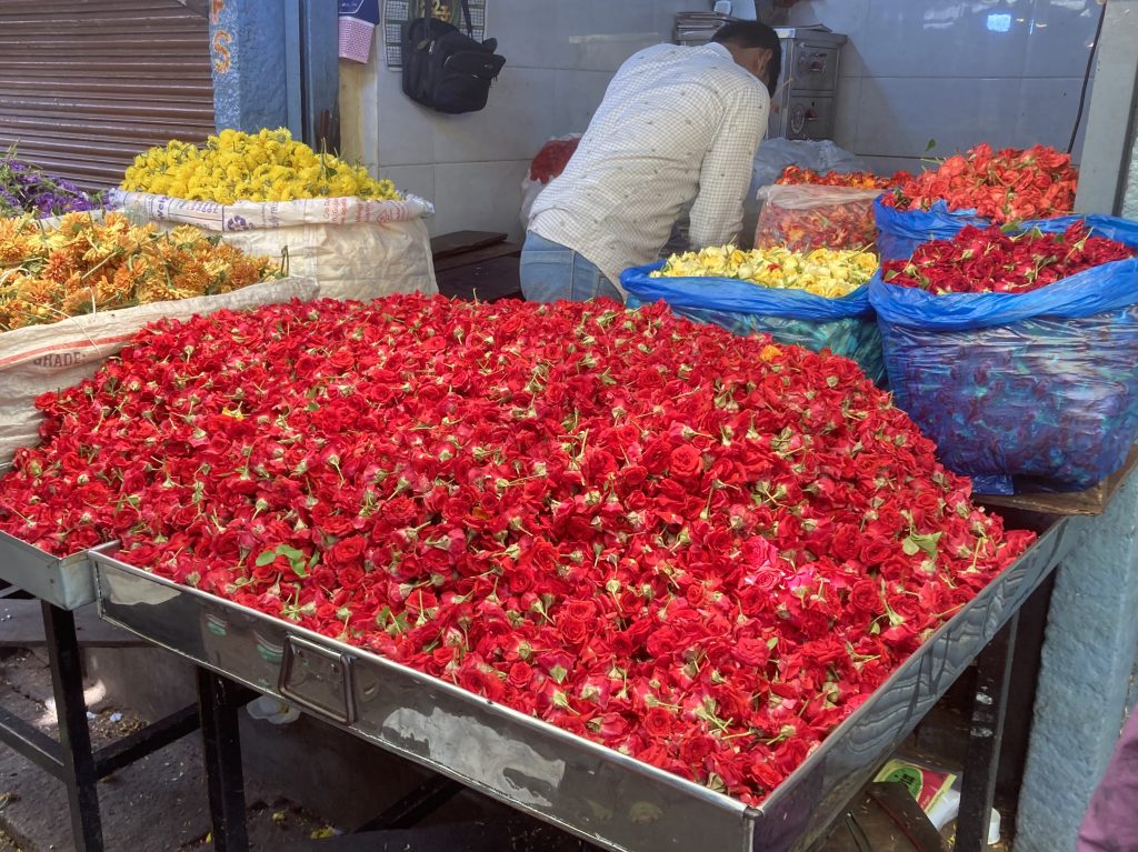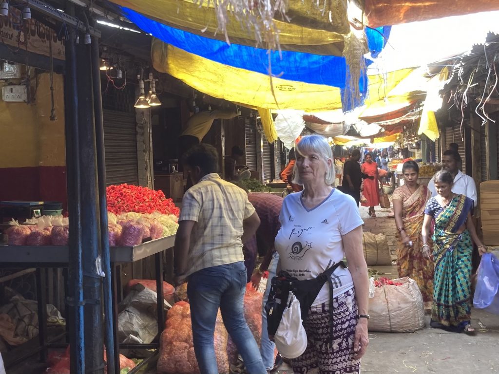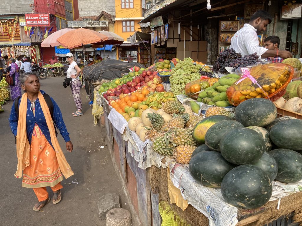 To ‘beat the heat‘, we left early next morning to visit the Devaraja Market, a large area of narrow semi-covered passageways, lined with traders of fruit, gloriously fresh vegetables of so many sorts, colourful blossoms and flowers, spices, delicacies and silks. The smells wafting through the market were delicious. It was perhaps not as vibrant and busy as we expected; maybe we were too early, maybe it was because it was Sunday and a religious holiday.