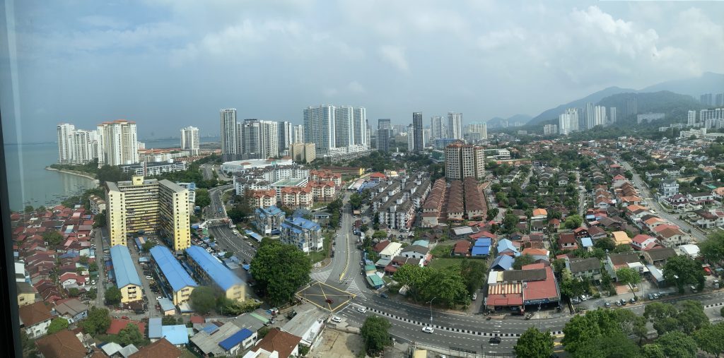 Lynne thinks that it’s probably over thirty years since she last visited Penang on a business trip, and it was unrecognisable with all its high-rise buildings. Our hotel had 31 floors, with an infinity pool on the tenth floor. We had a room on the 21st floor with a double aspect looking up and down the coast, across to the Penang peninsular and across to the Penang Hills.