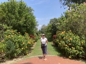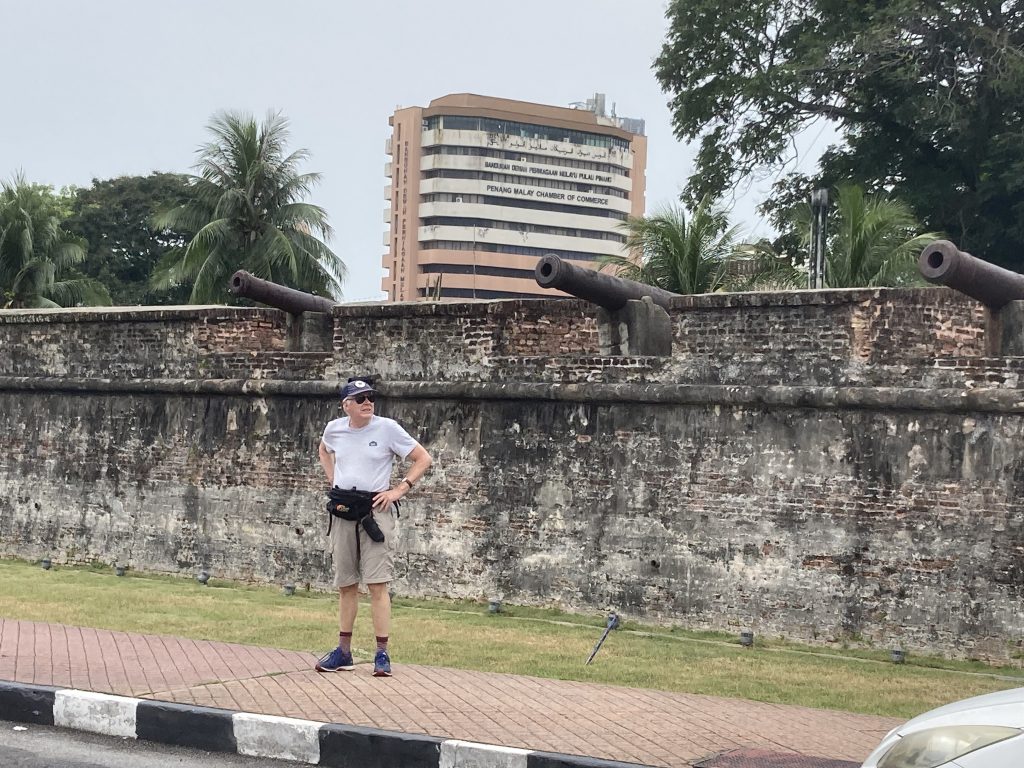 A fresh wind blew from the sea, flags flapping and the sun glinting in the waves. It was empty of people and cars, as we found our way to Fort Cornwallis. This is a previously stockaded, but now stone-walled fortress with a number of now peaceful rusting cannons (one Dutch one dated 1603) and a lighthouse.