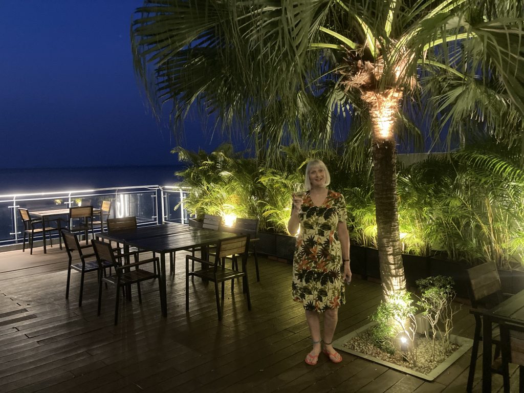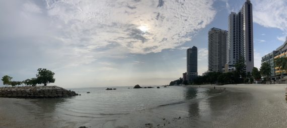 We arrived in Penang at just gone 10pm, 2.5 hour time zone ahead of Bengaluru. Just as we were beginning to get anxious at the baggage carousel, our rucksacks arrived. We were met by our booked driver and sped off to our hotel on the beach in the outskirts of George Town, about 45 minutes away. We arrived just in time to cajole the bartender to pour us a glass of wine each – that was our dinner!