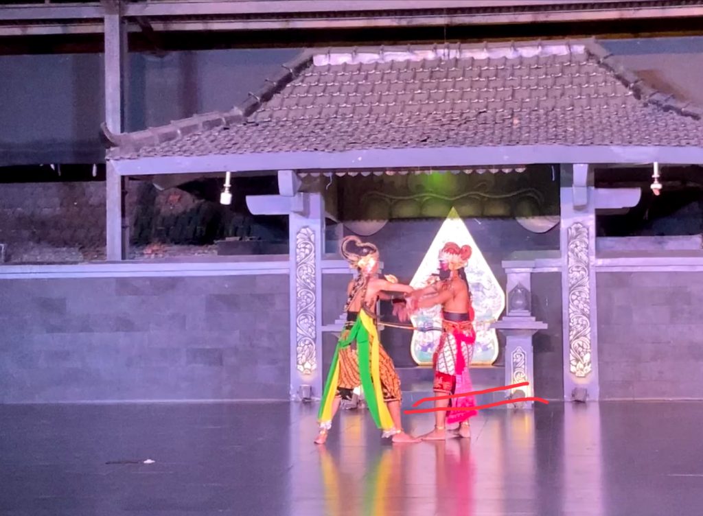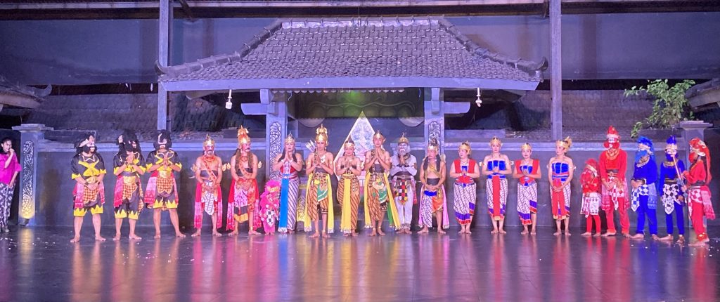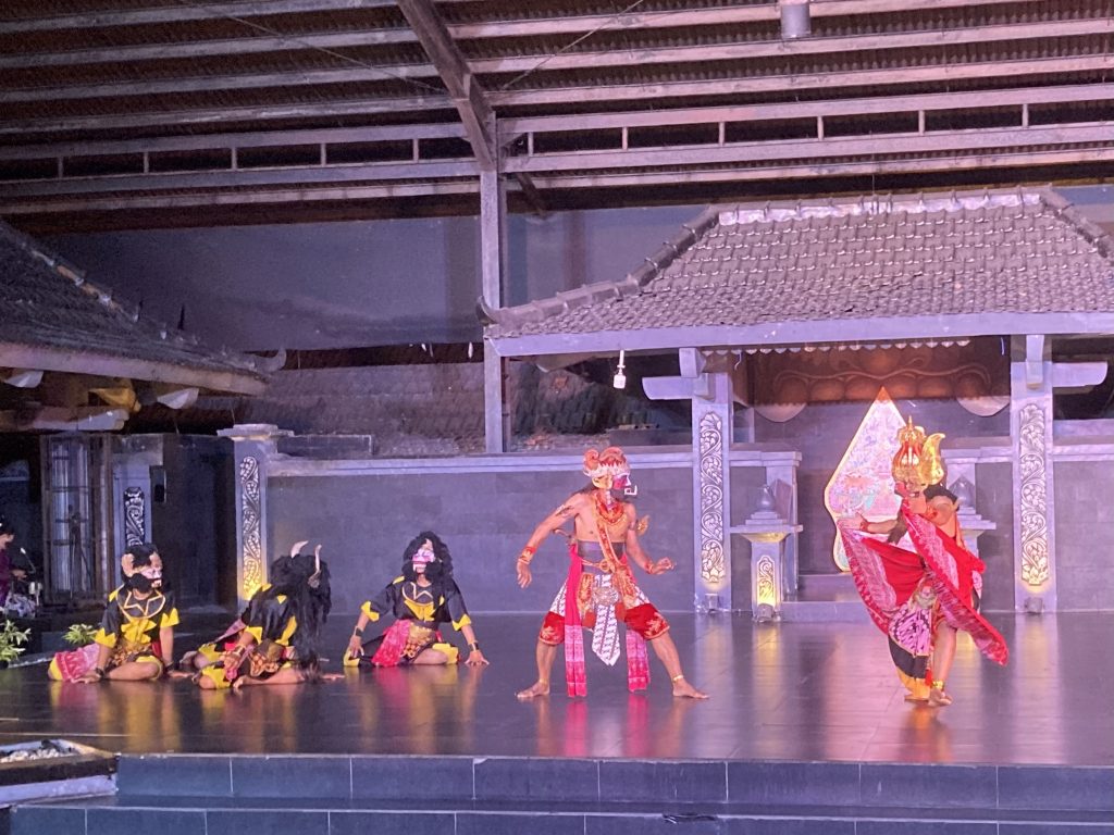 The performance was held on a wide, low apron stage, with a live Gamelan orchestra. The performers, beautifully dressed up, with incredible make-up, enacted a classical story of Ramayana. The Gamelan music is played with an ensemble of brass xylophones, gongs and drums, singing by two classically trained women and a man, augmented by occasional hand clapping and chanting by the performers.
