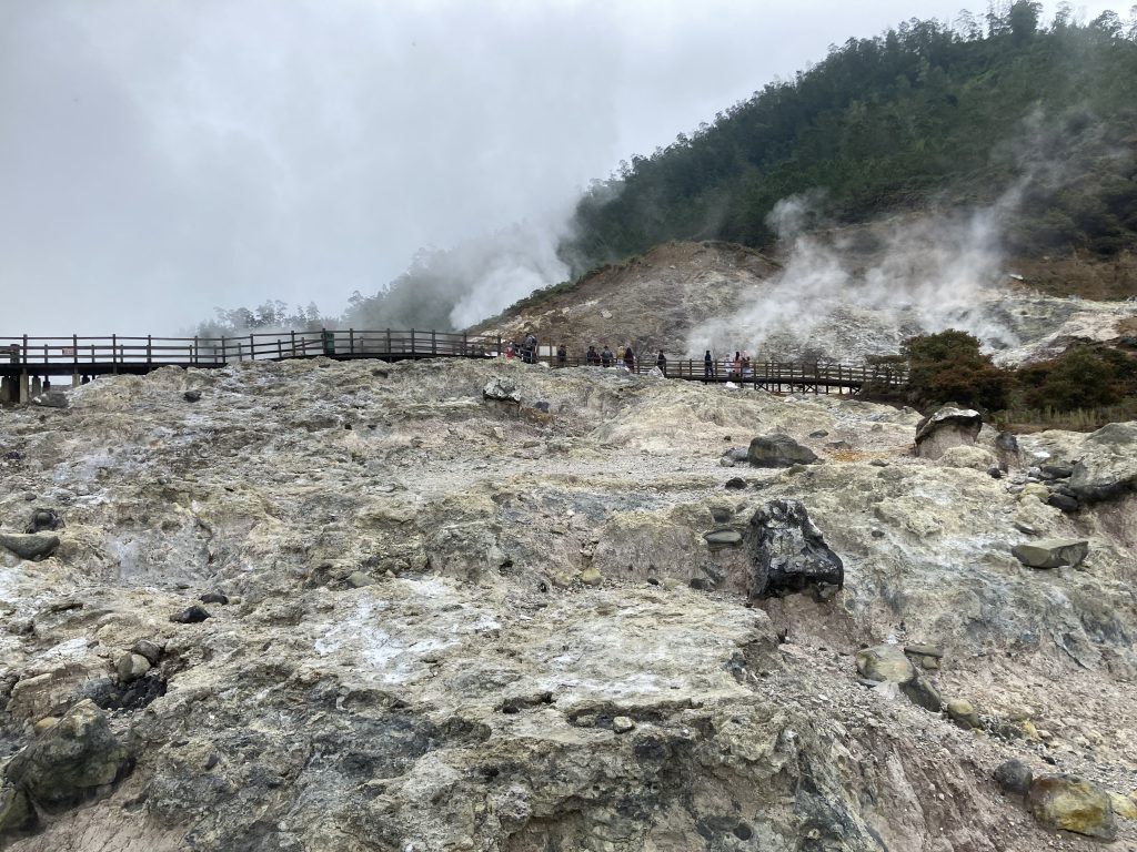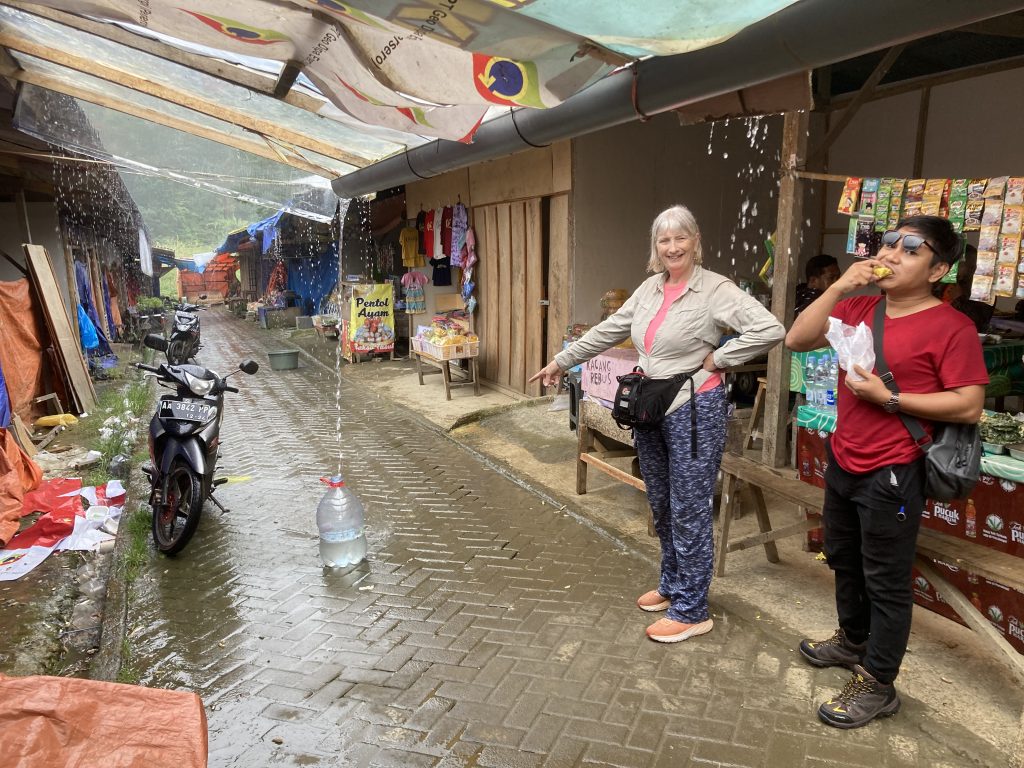 We visited volcanic sulphur pools at the Sikidang Crater, reminiscent of Rotorua in New Zealand, but without geysers. Then the heavens opened, and we zig-zagged through the market stalls, leading up to the exit, trying to shelter under whatever cover the tarpaulins offered, dodging the gushing water. We got soaked as, for once, we’d left our rain jackets in the car.