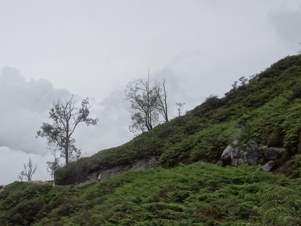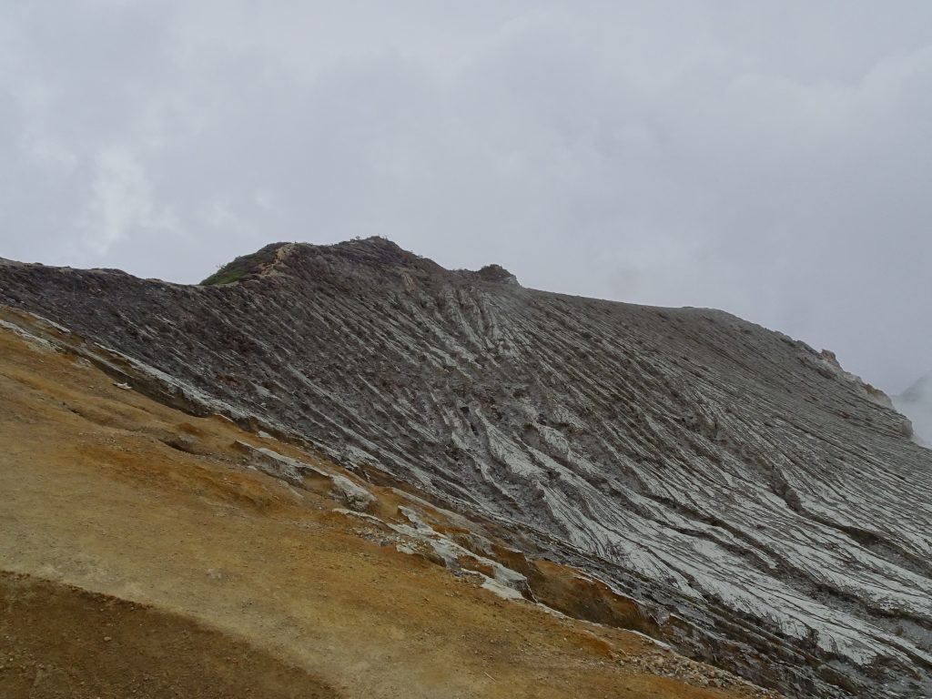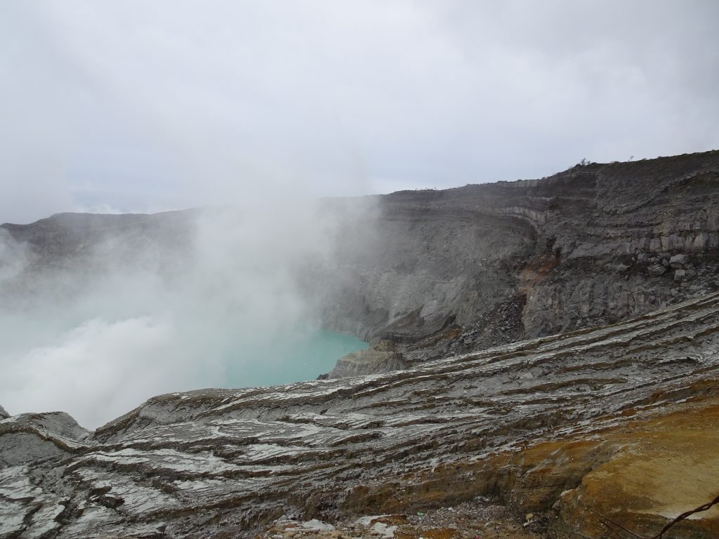 A sturdy 4×4 jeep took us through villages and dense jungle, where we started out trek up the Mount Ijen crater at 2,385m. Enveloped by mist and cloud, our view only cleared as we approached the top. What we saw was astonishing. Rifled volcanic rock descended down into a large turquoise lake, only occasionally visible through the smoke.