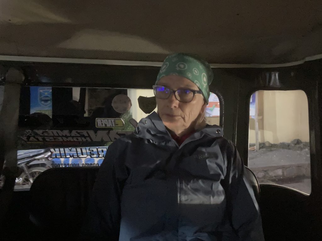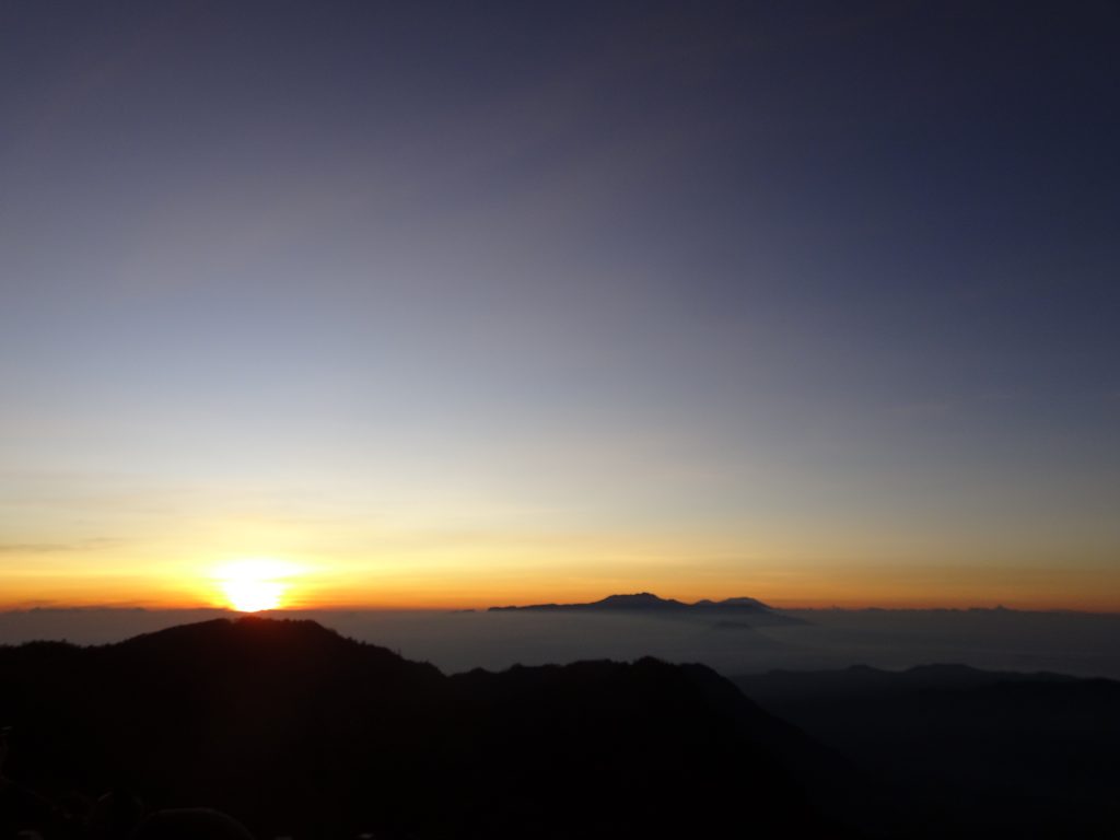 The sky in the east glowed dark red, slowly, slowly broadening out. Ahead of us, we discerned the contours of the mountains, slowly realising that the smudge of mist wasn’t mist – it was volcanic smoke.