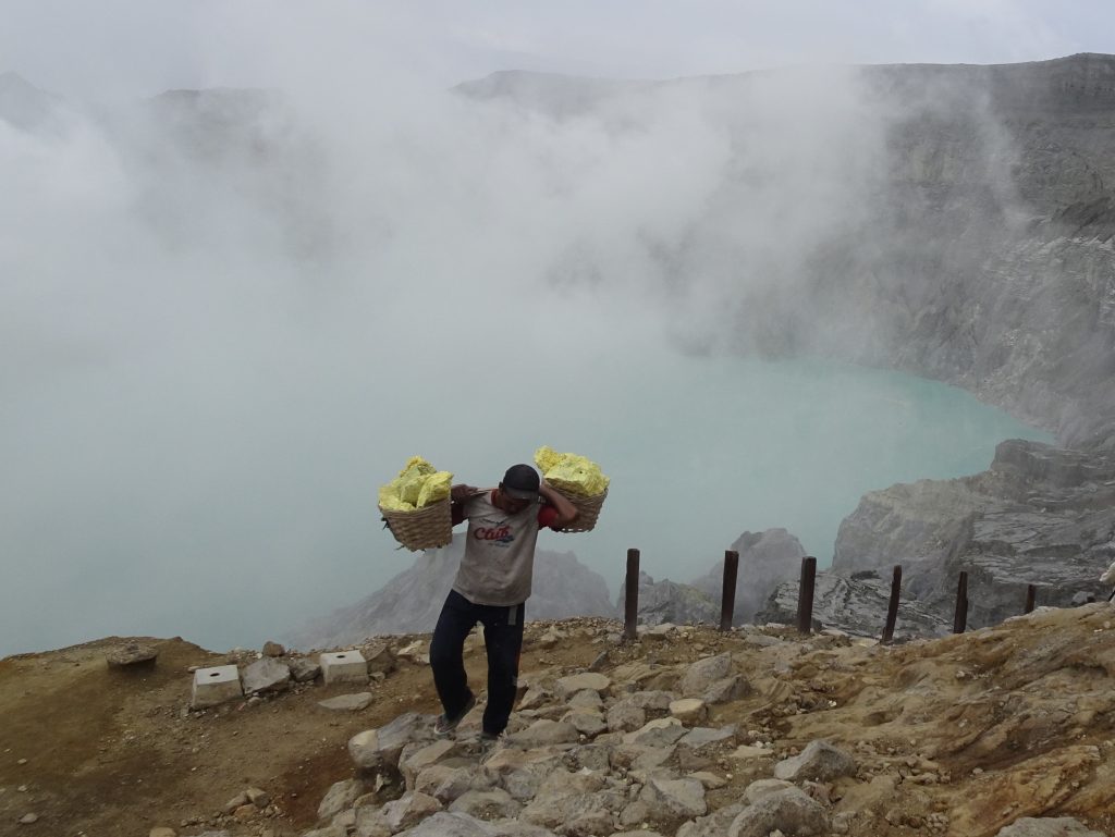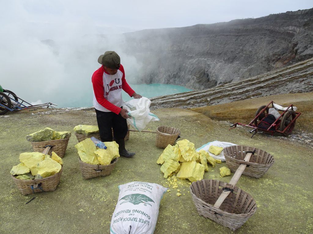 Men in flip-flops descended into the crater to collect and carry up large nuggets of bright yellow sulphur. They bundled these into bags and used barrows to wheel up to 240kg back down the steep path to the village.