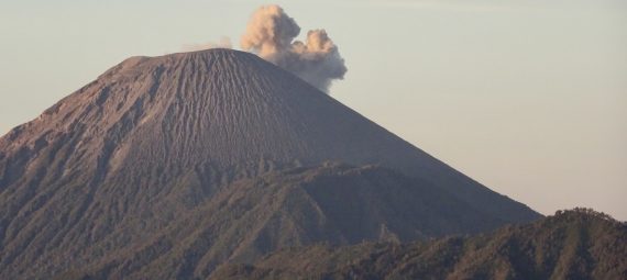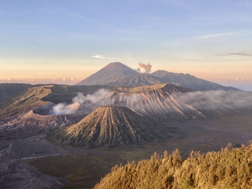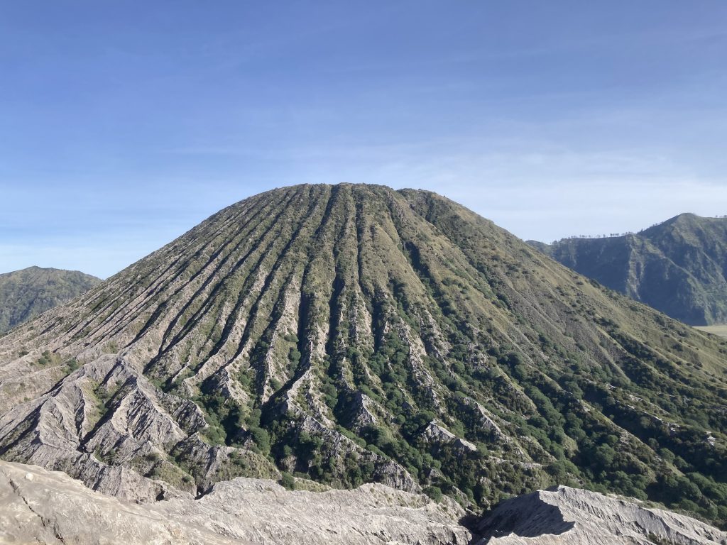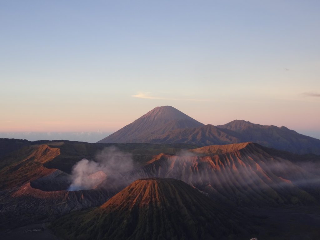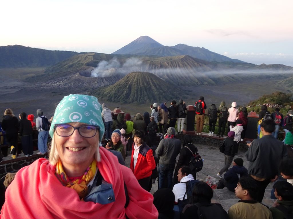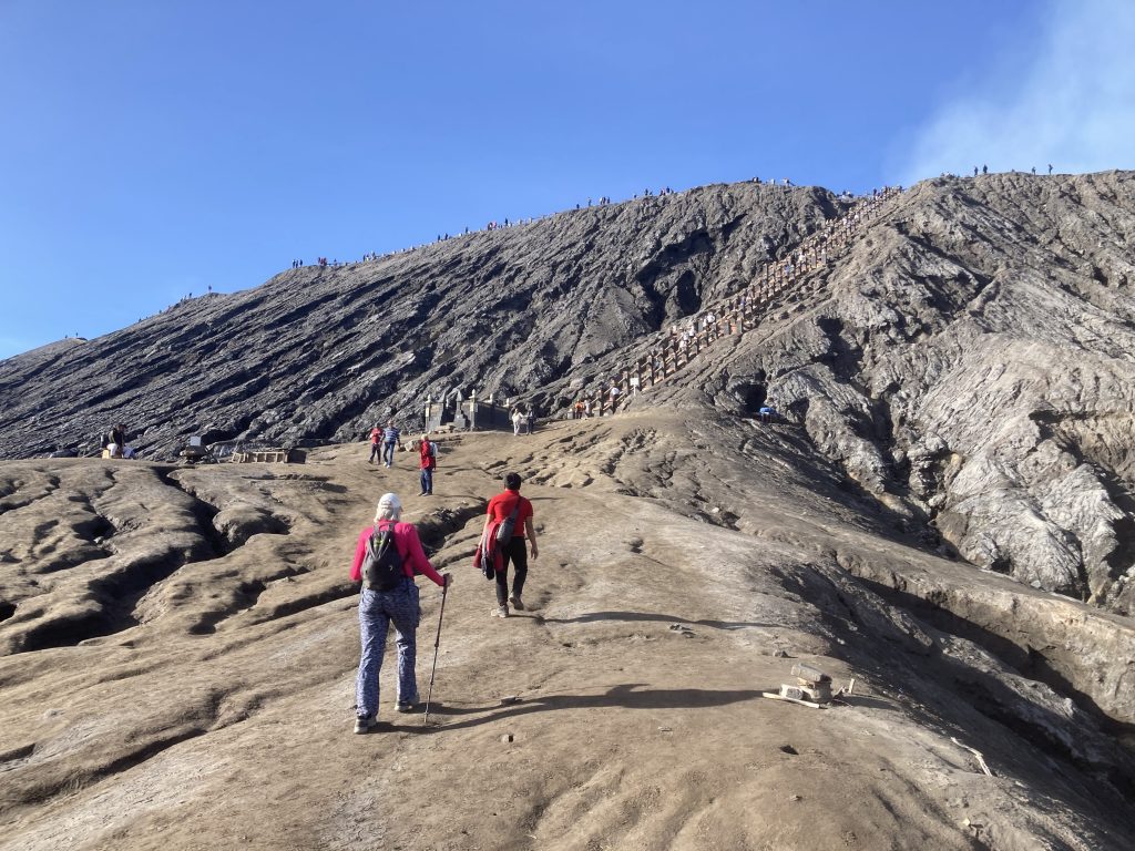 Despite the crowds, all with smartphones (and one small drone) taking pictures, it was a wonderfully surreal feeling to see the grandeur of the scene ahead of us. The perfectly shaped conical volcanic mountain Batok (2,440m), in a huge ‘sea of sand’, and the volcanic cloud seeping out of the Mt. Bromo caldera just beside it. We even witnessed a small eruption at the top of Indonesia’s highest mountain behind, Semeru (3,676m), with an angry billow of smoke.