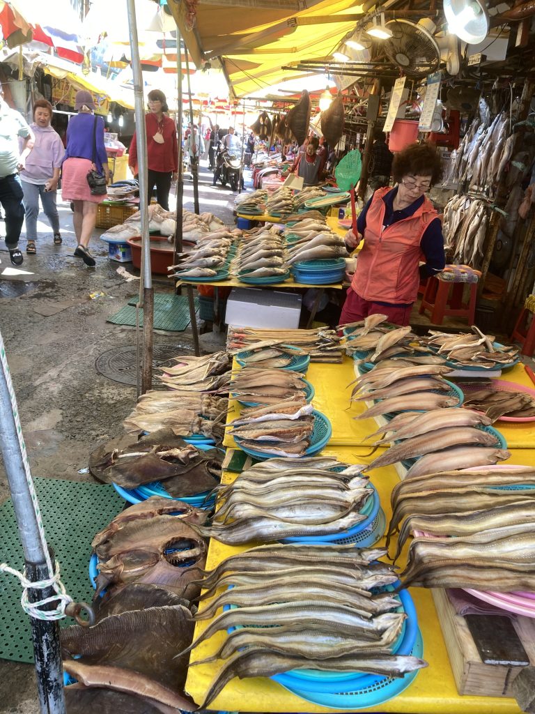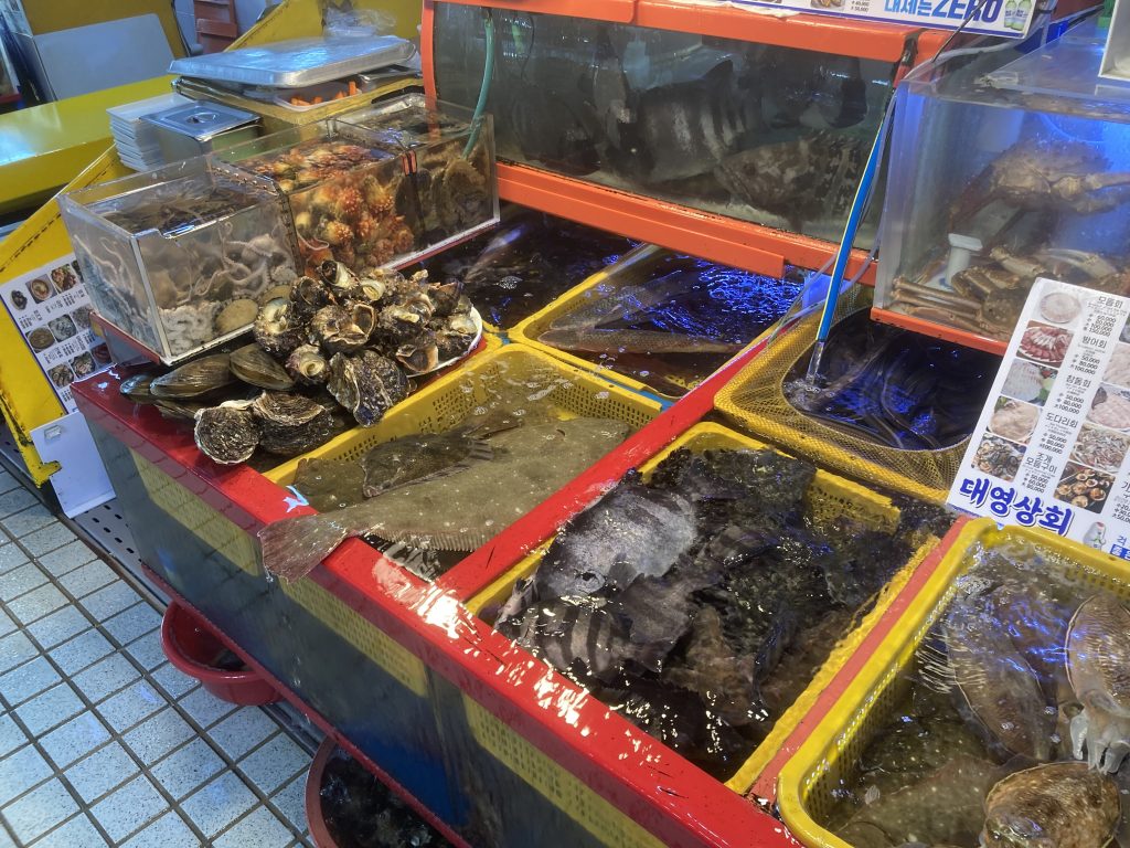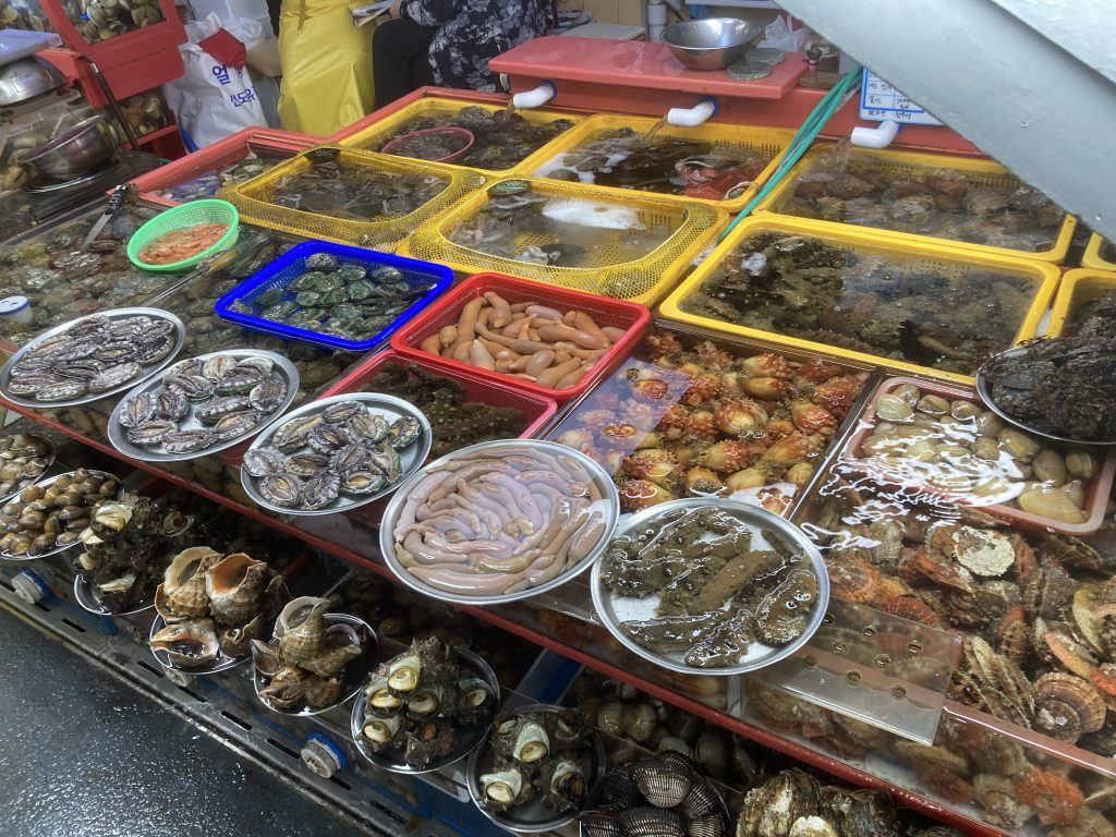 We arrived at the Jagalchi market to find fish for sale everywhere. We walked along a narrow street with “Ajummas” (older women) selling fish. Then we found a large building, with all manner of live fish on the ground floor, wriggling around, quantities of dried fish on the floor above, and the top floor with tables and chairs waiting for customers.