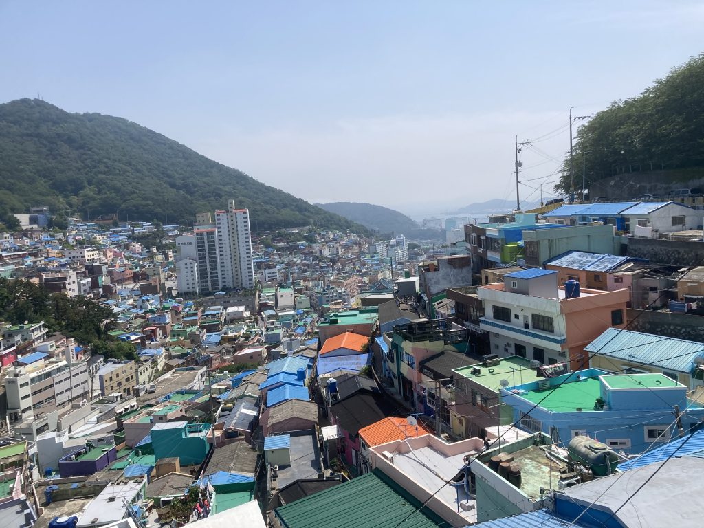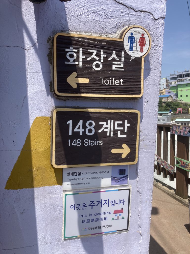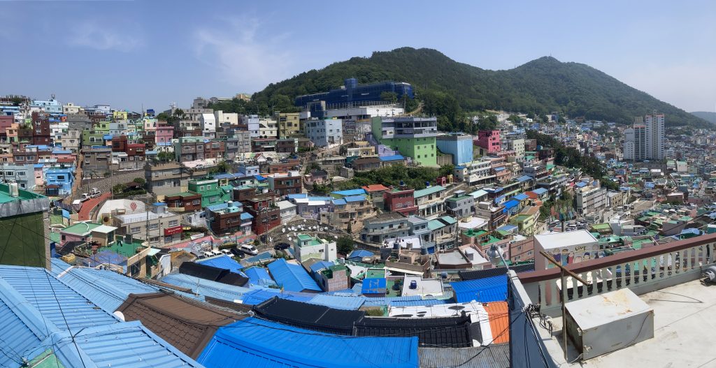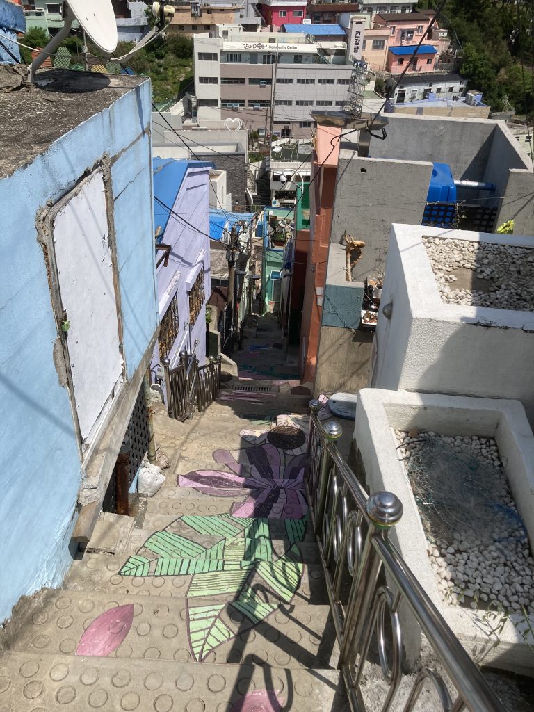 The village was nestled in a valley, high up a hill. It had been transformed into an attractive, colourful, community, with much art work. Its genesis lies in being part of the peninsular still controlled by the South Korean government during the Korean war. Many refugees built temporary accommodation on the terraces there. The area deteriorated into slum conditions until its latest artistic incarnation.