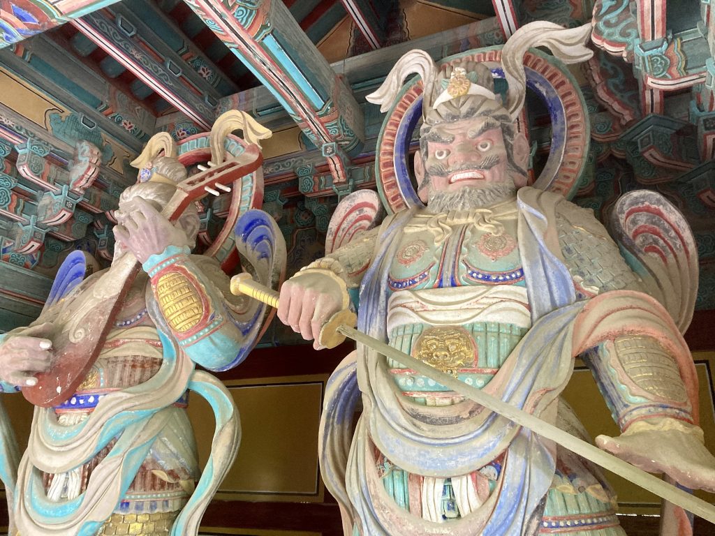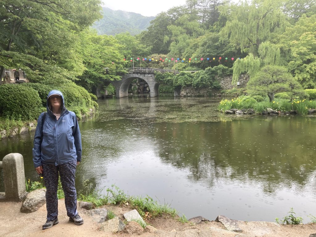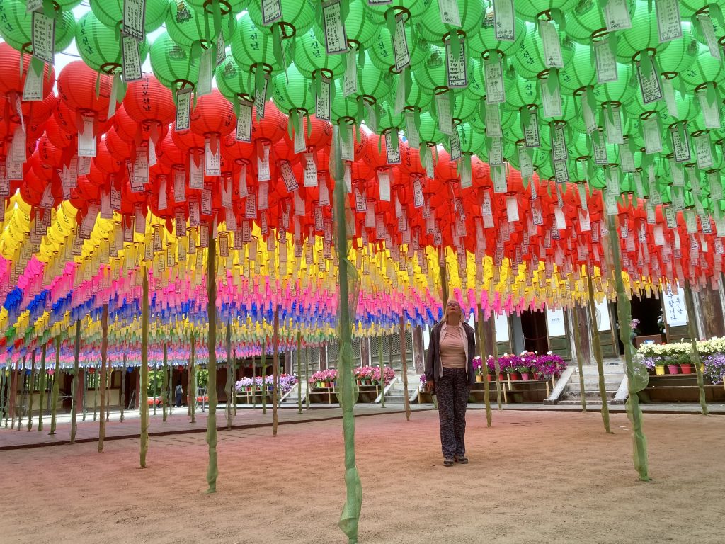 We visited Buddhist temples, Bulguksa, which started to be built in 751. At the entrance, it is stated, without irony, that: “The temple served as a center of Silla Buddhism and prayer for the protection of the country from foreign invasion. The entire temple was burnt down by Japanese invaders in 1593”. It was restored between 1969 -1973. The temples were beautifully decorated with colourful lanterns outside, but the rain was torrential.